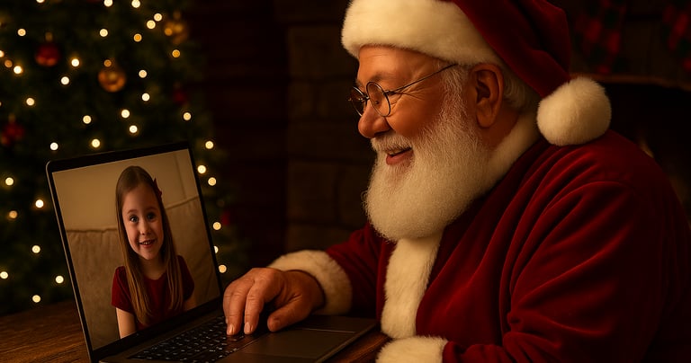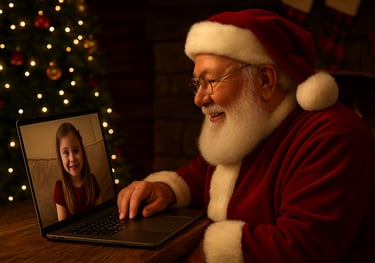 Experience the magic of Christmas from the comfort of your home or office! A live, interactive video call with Santa brings festive cheer straight to your screen. This personalized visit includes warm greetings, fun conversation, and holiday joy that everyone will remember. No matter where you are, Santa is just a click away—ready to make your Christmas truly magical!
